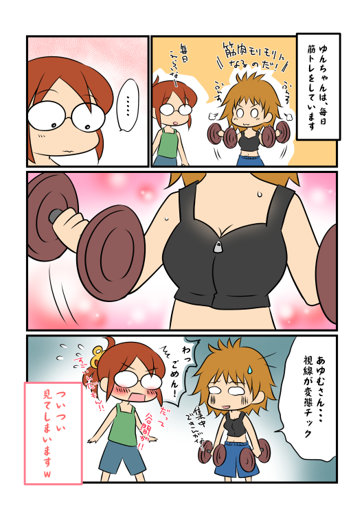 今年に入ってから、毎日筋トレをするようになったゆんちゃんです。筋トレする時には、スポーツブラしてやっているのですが、その時に出来る胸の谷間が凄くて!ついついガン見しては注意されています。普段見ないような凄い谷間なので、どうにも視線がいってしまって止めることが出来ません…。